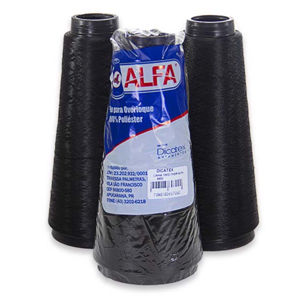 - FIO OVERLOCK, COR PRETA, 100% POLIÉSTER TEXTURIZADO, MARCA ALFA, CONE COM 100 GRAMAS.